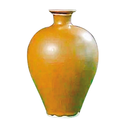 北宋定窑酱釉梅瓶收藏于江苏省金坛博物馆。梅瓶口径6.6厘米,腹径17.1厘米,底径7.5厘米,高22.7厘米。瓶口窄小,颈短肩宽,瓶身渐收,底部微微外撇,整体施酱色釉,外表泛黄色,又称为紫金釉,也称柿釉。因为釉料含铁,所以在高温中产生了类似铜器的质感。