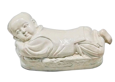 出自宋代定窑的白釉孩儿枕现收藏于台北故宫博物院。孩儿枕高18.8厘米,底径长31厘米,宽13.2厘米,以孩童背部为枕面,生动塑造了一个活泼可爱的男孩伏卧于榻上的形象。男孩梳发髻,脑门宽阔,两耳如扇,眉清目秀,眼睛圆而有神,透出一股灵气;身着绣花绫罗长衫、坎肩、长裤和软底布鞋,展示了宋代服饰的特点;趴在锦垫上,两臂交叉环抱,右手持璎珞绣球,头侧伏在交叠的手上,两只胖脚交叠,模样调皮可爱。