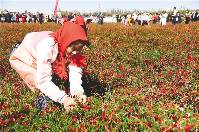 9月23日,巴彦淖尔市杭锦后旗二道桥镇万亩“红色产业”园区里正在进行手工摘辣椒比赛。今年二道桥镇在保障粮食安全的基础上,大力推进“红色产业”发展,辣椒产业已成为二道桥镇优势产业。 本报记者 图古斯毕力格 摄