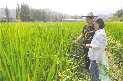 9月24日,在太阳镇太阳米稻田基地,基地负责人陈梅芳(右)在指导农户稻蛙养殖。在她的牵头下,太阳镇推广稻蛙共养水稻约500亩,每亩可额外增加6000元收入。近年来,浙江省杭州市临安区太阳镇把有能力、有干劲的青年创客培育成乡村振兴领军人才,推动餐饮民宿、乡村旅游等多领域融合发展,促进农民增收,壮大集体经济,为实现乡村共同富裕注入强劲动力,绘就美丽乡村新画卷。 新华社记者 徐昱 摄