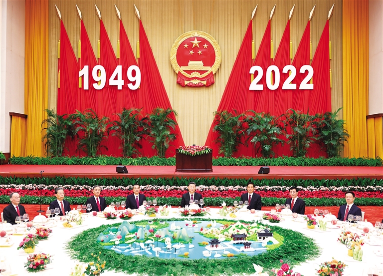人民大会堂宴会厅华灯璀璨、鲜花绽放,洋溢着喜庆热烈的节日气氛。主席台上方,庄严的国徽高悬,“1949-2022”的大字年号在鲜艳的红旗映衬下格外醒目。