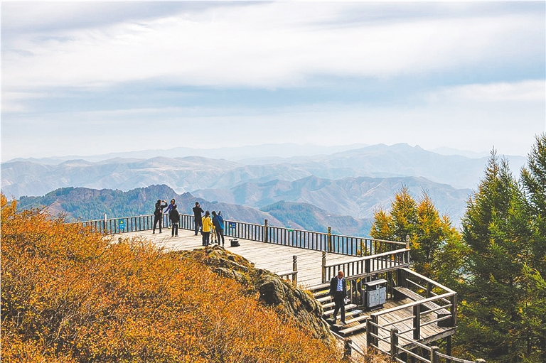 国庆假期,游客站在兴和苏木山最高点黄石崖上,眼前一片金色的世界,令人心旷神怡。4A级景区苏木山森林公园,被誉为“人间仙境、天然氧吧”,占地面积23.6万亩,森林覆盖率71%,是内蒙古中西部地区最大的人工林场。如今的苏木山年均接待游客20多万人,带动了周边群众就业增收。 兴和协 摄