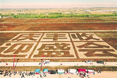 国庆假期,在巴彦淖尔市杭锦后旗二道桥镇万亩红色产业园区内,当地农民在连片的辣椒地里绘出“庆丰收 迎盛会”的字样,庆祝农民丰收节和国庆节,也让这里成为最受欢迎的网红打卡地。本报记者 图古斯毕力格 摄