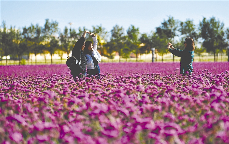 近日,居民在巴丹吉林镇柳叶马鞭草花海观花拍照。明媚的秋日,阿拉善盟阿右旗巴丹吉林镇汽车营地的120亩柳叶马鞭草,成为北疆边陲小镇的一道亮丽的风景。近年来,阿右旗着力推动生态文明建设,统筹推进山水林田湖草沙系统治理,实现了美丽与发展共赢。