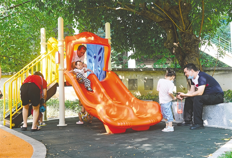 10月10日,在位于广州市花都区的紫兰口袋公园里,家长带着孩子玩耍。近年来,广州持续推动城市口袋公园建设,充分利用城市的边角地、闲置地实施“见缝插绿”,形成了一处处可供周边居民休闲、散步、健身及开展亲子活动的生态活力空间,构筑城市绿色新街景。 新华社记者 卢汉欣 摄