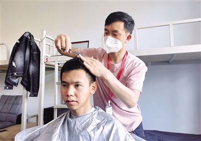 10月26日,内蒙古艺术学院的辅导员老师为学生理发。疫情期间,由于校园封闭管理,学生的理发成了难题,辅导员老师们纷纷化身美发师,主动义务给学生理发, 这样的暖心举动受到了同学们的点赞。本报记者 王磊 通讯员 李娜 摄
