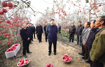 在村苹果洗选车间,习近平听取当地苹果产业发展情况,并察看分拣装箱生产线。现场摆放了当地种植的各种苹果和深加工产品,习近平饶有兴趣地一一端详,仔细听取介绍,对当地发展现代农业和乡村旅游、培育壮大集体经济、带动老乡们增收致富的做法表示肯定。