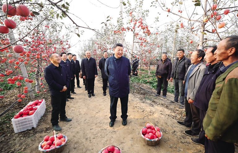 车间外,老乡们聚集在一起,高声向总书记问好。习近平同老乡们拉起家常,回忆当年他在陕北的知青岁月。习近平对老乡们说,我在陕北生活了7年,当年看到老乡们生活很艰苦,心里就想着怎么样让大家生活好起来。这次来延安,看到一派硕果累累的丰收景象,交通条件大为改善,发生了翻天覆地的变化。过去陕北老乡们修梯田、种庄稼,面朝黄土背朝天,抡起老锄头干活,广种薄收,十分辛苦,如今山坡上退耕还林种上了苹果,老乡们有工作、有稳定收入,孩子有好的教育,老人都有医保,生活越来越好。从陕北的变化就可以看到中国的变化。习近平指出,现在,“两个一百年”奋斗目标的第一个百年目标已经实现,绝对贫困问题解决了,老乡们过上了好日子,但还要继续努力往前走,让生活越来越美好。陕北的气候、光照、纬度、海拔等非常适宜发展苹果种植,加上滴灌技术、矮化种植技术、选果生产线等不断发展,就地卖出,销路不愁,大力发展苹果种植业可谓天时地利人和,这是最好的、最合适的产业,大有前途。习近平强调,中国共产党是人民的党,是为人民服务的党,共产党当家就是要为老百姓办事,把老百姓的事情办好。空谈误国,实干兴邦。要认真学习贯彻党的二十大精神,全面推进乡村振兴,把富民政策一项一项落实好,加快推进农业农村现代化,让老乡们生活越来越红火。老乡们爆发出雷鸣般的掌声。