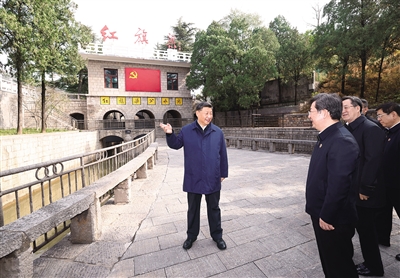 28日上午,习近平来到河南安阳林州市红旗渠纪念馆。上世纪60年代,当地人民为解决靠天等雨的恶劣生存环境,在党和政府支持下,在太行山腰修建了引漳入林水利工程,被称为“人工天河”。习近平走进展馆,依次参观了“千年旱魔,世代抗争”、“红旗引领,创造奇迹”、“英雄人民,太行丰碑”、“山河巨变,实现梦想”、“继往开来,精神永恒”等展览内容。习近平指出,红旗渠就是纪念碑,记载了林县人不认命、不服输、敢于战天斗地的英雄气概。要用红旗渠精神教育人民特别是广大青少年,社会主义是拼出来、干出来、拿命换来的,不仅过去如此,新时代也是如此。没有老一辈人拼命地干,没有他们付出的鲜血乃至生命,就没有今天的幸福生活,我们要永远铭记他们。今天,物质生活大为改善,但愚公移山、艰苦奋斗的精神不能变。红旗渠很有教育意义,大家都应该来看看。随后,习近平实地察看红旗渠分水闸运行情况,详细了解分水闸在调水、灌溉、改善生态环境等方面的重要作用。