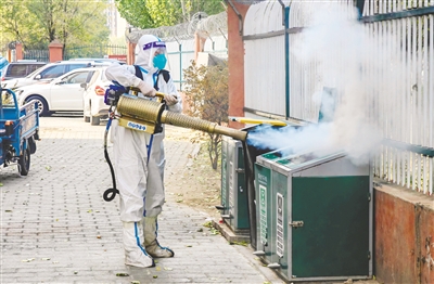 10月31日,呼和浩特市赛罕区滨河湾小区物业工作人员正在进行环境消杀。本轮疫情发生后,物业工作人员始终坚守岗位,垃圾转运、楼内楼外环境消毒消杀、派送生活用品和药品、上门维修维护……他们用贴心的服务为居民筑起一道坚实而温暖的“防护墙”。