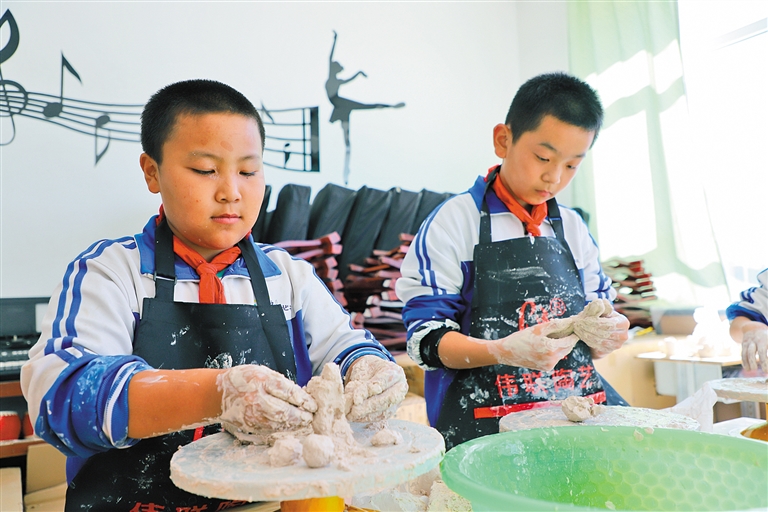 | 兴安盟突泉县六户中心小学学生在上陶泥课。内蒙古持续推动县域义务教育均衡发展,到2021年,全区中小学体育、音乐、美术、理科实验仪器配备学校达标率达到97%以上,103个旗县(市、区)全域通过国家义务教育发展基本均衡评估认定,正在向优质均衡迈进。本报记者 高敏娜 通讯员 曾令刚 摄 |