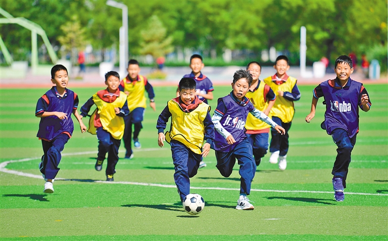 | 鄂尔多斯市杭锦旗亿利东方学校的小学生们在足球场上积极拼抢。截至今年9月,我区共建成国家级校园足球特色学校1286所,培育了国家级校园足球特色幼儿园446所。教育部认定并命名我区全国青少年校园足球试点县(区)9个,全国青少年校园足球“满天星”训练营名单5个。本报记者 王磊 摄 |