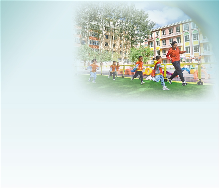 | 乌兰察布市直属幼儿园教师带领小朋友们在室外进行游戏。十年来,内蒙古大力推进学前教育公益普惠发展,大力发展公办园,积极扶持普惠性民办幼儿园发展,越来越多家庭能够就近享受普惠性学前教育资源。唐璇博 摄 |