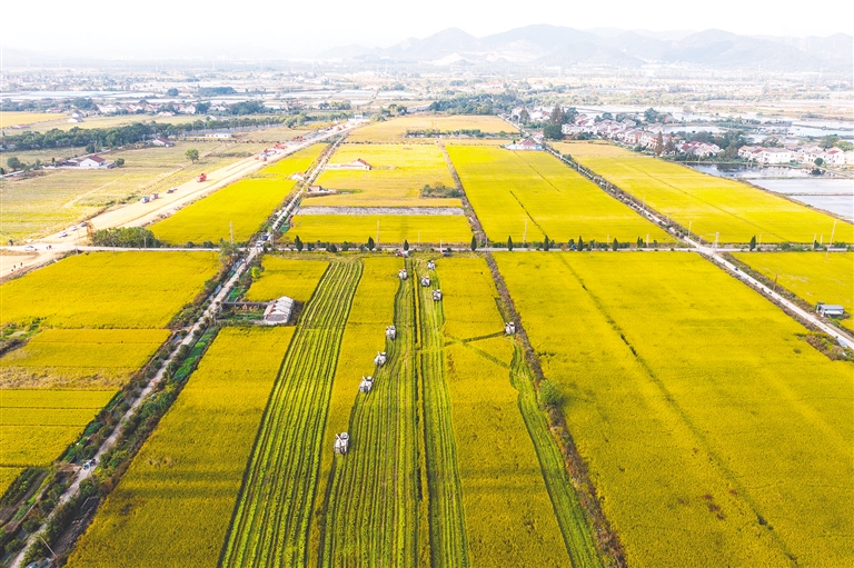 11月1日,在浙江省湖州市吴兴区东林镇保丰村,收割机在收割晚稻(无人机照片)。近期,浙江省湖州市吴兴区东林镇的数千亩晚稻进入收割期。当地运用数字化系统统一调度收割机、运输车、烘干机等农业机械,完成秋粮收割、烘干、打包、装车全过程。 新华社记者 徐昱 摄