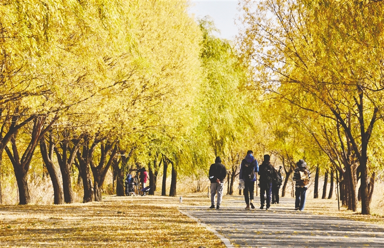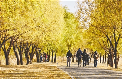 游人在北京野鸭湖国家湿地公园内赏秋(11月1日摄)。北京野鸭湖湿地自然保护区位于北京市延庆区西北部,始建于1997年,总面积6873公顷,是目前北京地区面积最大、类型最多、生物多样性最丰富的湿地,是国际鸟类迁徙路线和华北地区鸟类的迁徙中转站,每年都会迎来成千上万只候鸟在此中转、栖息。