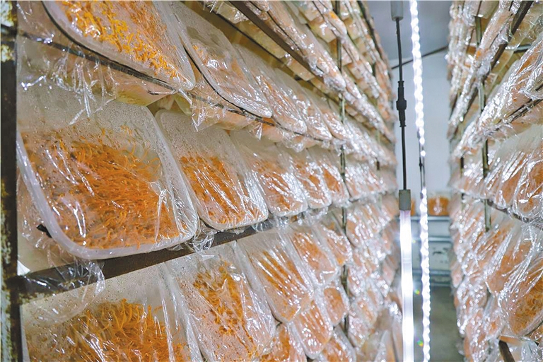“现在厂内员工有30人,如果我们满负荷生产,将带动100多人在这里就业。”薛珠同介绍说,蛹虫草属于立体栽培,占地900平方米的一栋大棚可栽培4万盆左右。近年来,公司与各大院校及科研机构携手,不断提高蛹虫草种植水平,并开发与完善蛹虫草延伸产品。目前,内蒙古景方特色农业科技有限责任公司蛹虫草种植大棚共27栋,其中投入使用11栋,年产鲜蛹虫草1000吨,年产值达2000余万元。