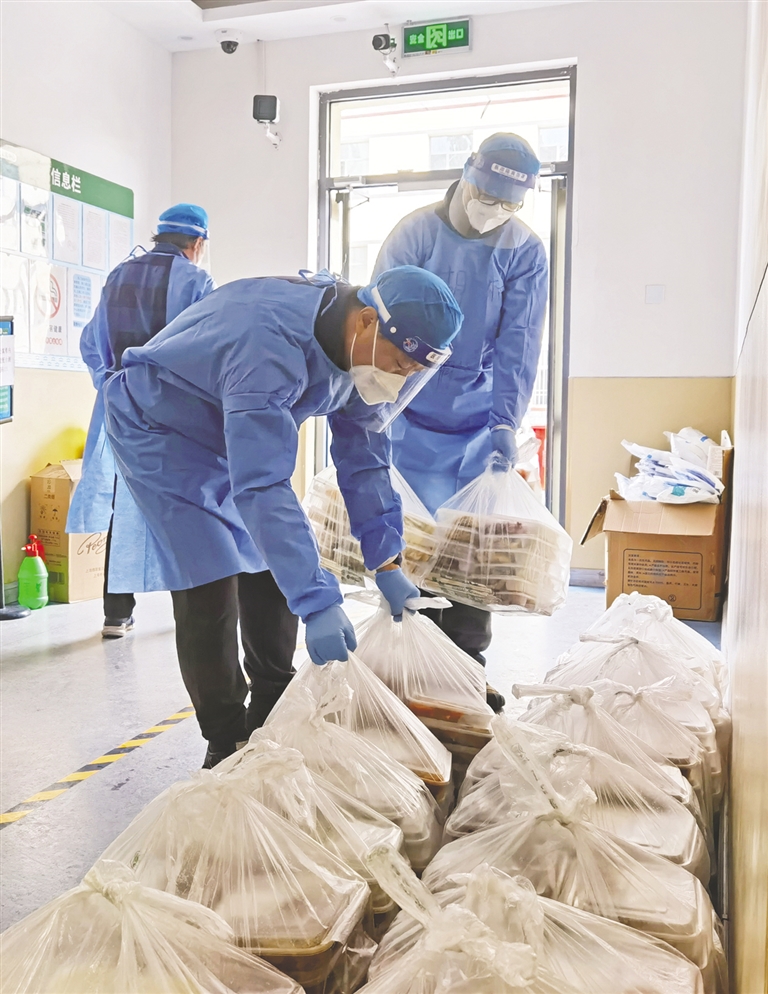 近日,内蒙古农业大学教师志愿者在为西区4号公寓的学生送餐。疫情发生以来,该校6位教师志愿者24小时值班,积极解决4号楼89间宿舍489名学生的需求和问题。此外,教师们还承担着线上教学任务,保证教学正常运行,他们用实际行动守护校园安全和师生健康。本报记者 王磊 通讯员 王丽 摄