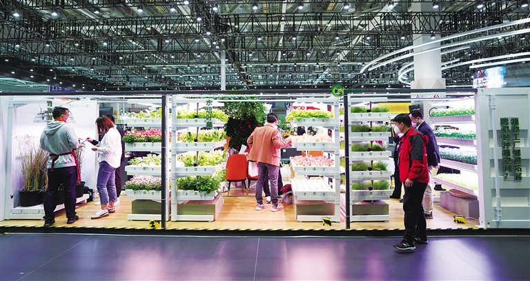 11月7日,观众在第五届进博会食品及农产品展区参观集装箱植物工厂的模型。在第五届进博会的食品及农产品展区,光明母港(上海)种业科技有限公司将集装箱植物工厂的模型搬进展会,在超市货架般的装置上一层层排列种植蔬菜,现场展示智慧农业的新发展模式。 新华社记者 刘颖 摄