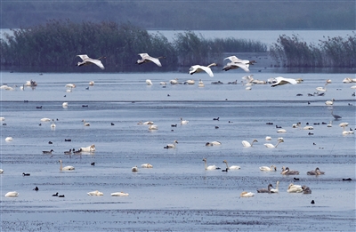 11月11日,天鹅等鸟类在庐江县黄陂湖栖息。近年来,安徽省合肥市庐江县在该县境内的原渔业湖区黄陂湖水域及周边,开展退耕、退渔、退养政策以及水环境综合治理,生态修复成果明显。目前,飞临黄陂湖水域的天鹅等候鸟种类和数量都显著增加,原先的老渔场变成美丽天鹅湖。新华社记者