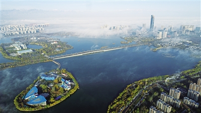 这是银川上空的平流雾景观(11月12日摄,无人机照片)。当日,“塞上湖城”宁夏银川上空出现平流雾景观,宛若仙境。 新华社记者 王鹏 摄