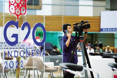 11月13日,媒体工作者在印度尼西亚巴厘岛的峰会媒体中心工作。二十国集团领导人第十七次峰会即将在印度尼西亚巴厘岛举行。新华社记者 王益亮 摄