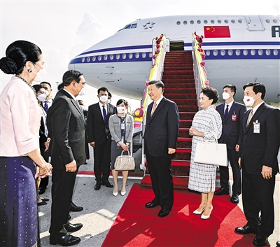 习近平和夫人彭丽媛乘坐的专机抵达曼谷素万那普国际机场时,泰国总理巴育夫妇、副总理兼外长敦夫妇、文化部部长伊提蓬夫妇等热情迎接。礼兵分列红地毯两侧,身着靓丽民族服装的当地青年行合十礼夹道欢迎,泰国华侨华人代表挥舞中泰两国国旗,向习近平夫妇表示最热烈的欢迎。