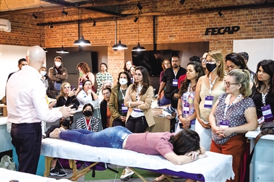 11月26日,在巴西圣保罗举行的世界中医药大会上,一名中医为嘉宾讲解中医正骨手法。第十九届世界中医药大会26日在巴西圣保罗开幕,为期两天的大会以“推动中医药高质量全球发展,为增进各国人民健康福祉做贡献”为主题。此次会议是世界中医药大会第一次走入南美洲。 新华社记者 王天聪 摄