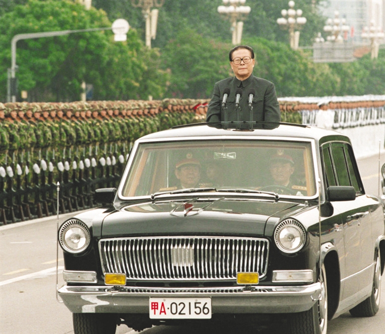| 左图:一九九九年十月一日,中华人民共和国成立五十周年盛大庆典在北京天安门广场举行。江泽民同志检阅由人民解放军陆海空三军和人民武装警察部队、民兵预备役部队组成的地面方队。 |