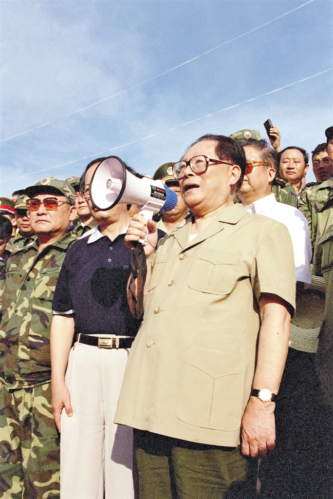 | 左图:1998年8月13日至14日,江泽民同志亲赴湖北长江抗洪抢险第一线,看望、慰问、鼓励奋战在抗洪抢险第一线的广大军民,指导抗洪抢险斗争。这是8月13日江泽民同志在洪湖市乌林镇中沙角险段大堤上,向正在抗洪抢险的军民发表讲话。 |