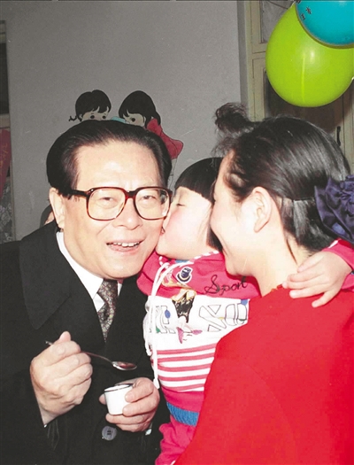 | 右图:1993年12月5日,江泽民同志在北京为一位幼儿园儿童喂服脊髓灰质炎疫苗后,小朋友亲吻江爷爷。 |