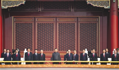 | 右图:2019年10月1日,庆祝中华人民共和国成立70周年大会在北京天安门广场隆重举行。这是习近平同志、江泽民同志、胡锦涛同志等在天安门城楼上。 |