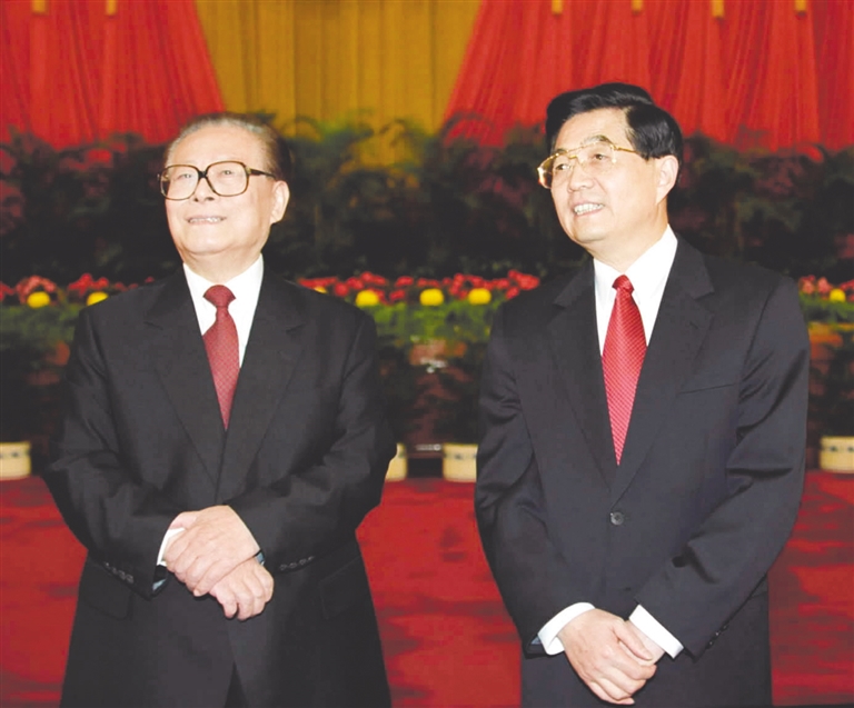 | 左图:2002年11月15日,江泽民同志、胡锦涛同志在北京人民大会堂亲切会见出席党的十六大代表、特邀代表和列席人员并发表重要讲话。 |