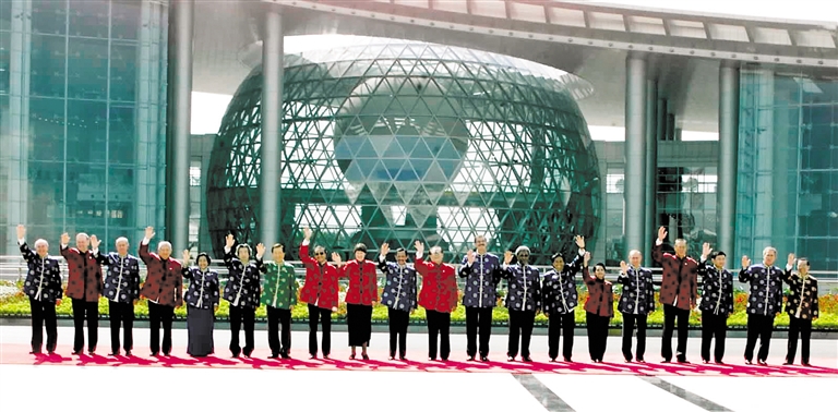 | 左图:2001年10月21日,亚太经合组织第九次领导人非正式会议在上海举行。这是江泽民同志与参会的经济体领导人合影。 |
