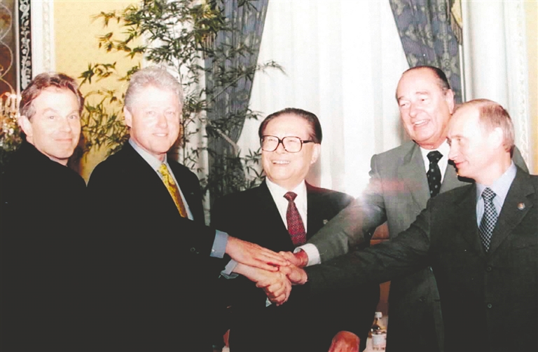 | 左图:2000年9月7日,由中国倡议的联合国安理会五个常任理事国首脑会议在纽约举行。江泽民同志(中)同法国总统希拉克(右二)、俄罗斯总统普京(右一)、英国首相布莱尔(左一)、美国总统克林顿(左二)握手合影。 |