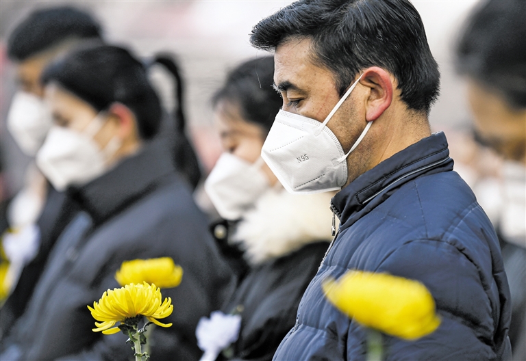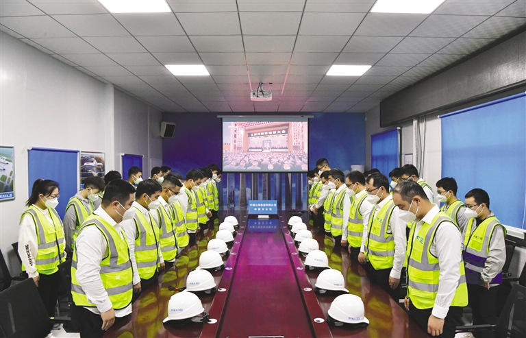 | 这是在河南郑州中原数字产业园(西园)项目工地,中建三局的建设者肃立默哀。 新华社记者 李嘉南 摄 |