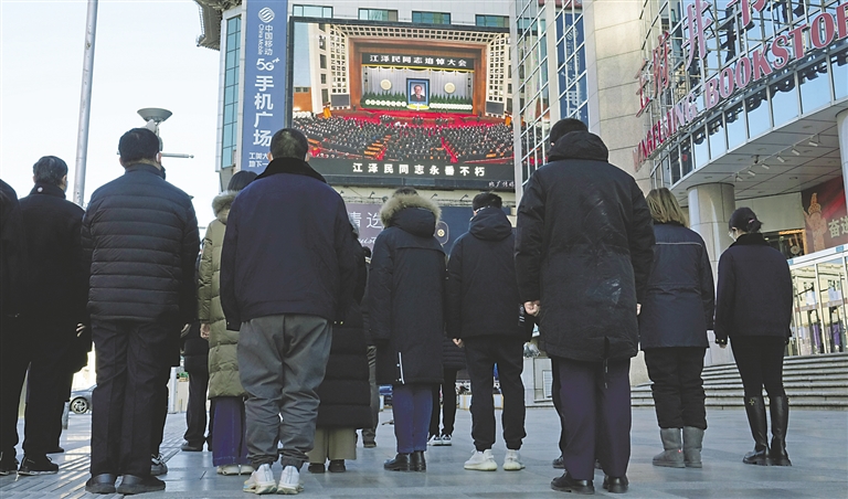 | 12月6日上午,中共中央、全国人大常委会、国务院、全国政协、中央军委在北京人民大会堂隆重举行江泽民同志追悼大会。举国上下,各族人民沉痛悼念江泽民同志。这是在北京王府井大街,群众肃立默哀。新华社记者 鞠焕宗 摄 |