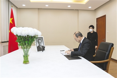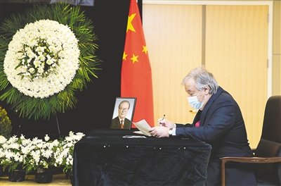 | 十二月五日,联合国秘书长古特雷斯在中国常驻联合国代表团驻地吊唁江泽民同志。