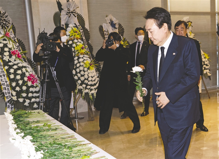 | 12月2日,韩国总统尹锡悦在中国驻韩国大使馆吊唁江泽民同志。 新华社发(李相浩 摄) |