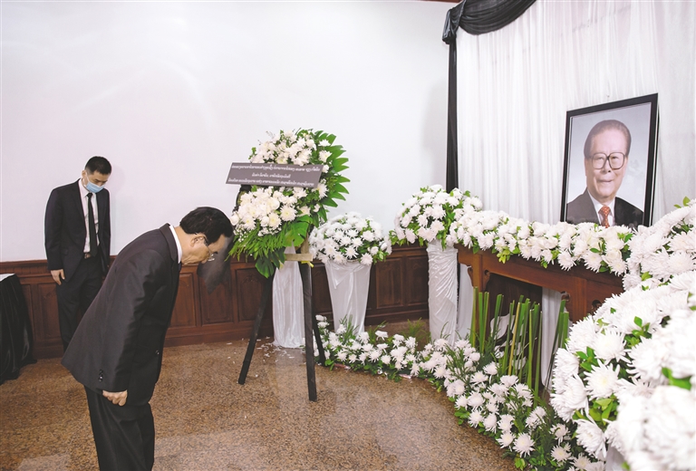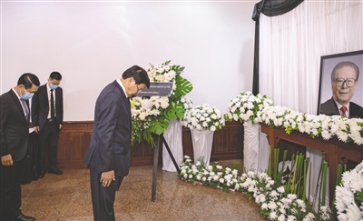 | 12月5日,老挝总理潘坎在中国驻老挝大使馆吊唁江泽民同志。 新华社发(凯乔 摄) |