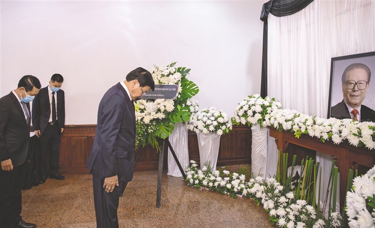 | 12月5日,柬埔寨首相洪森在中国驻柬埔寨大使馆吊唁江泽民同志。 新华社发(万坡 摄) |