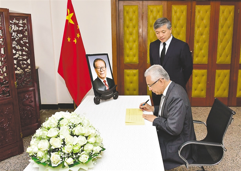 | 12月2日,毛里求斯总理贾格纳特在中国驻毛里求斯大使馆吊唁江泽民同志。 新华社发(中国驻毛里求斯大使馆供图) |