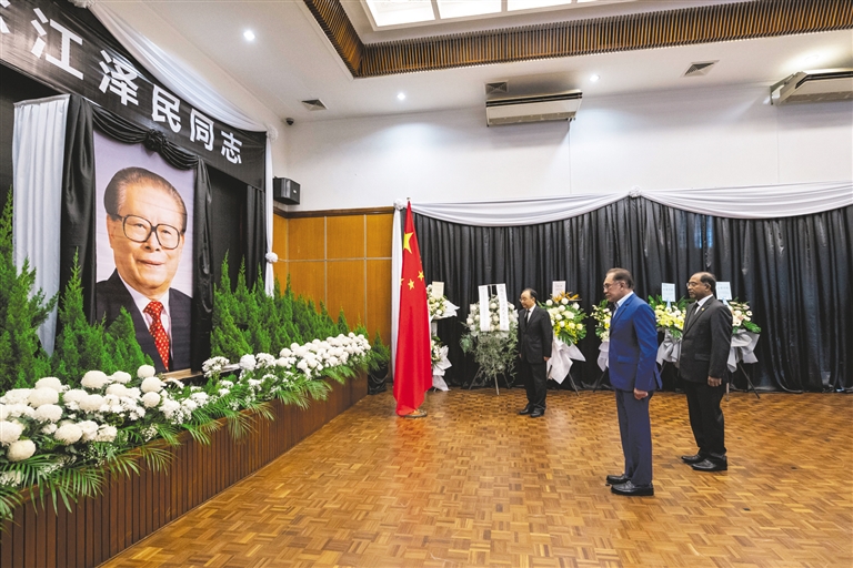 | 12月6日,马来西亚总理安瓦尔(右二)在中国驻马来西亚大使馆吊唁江泽民同志。