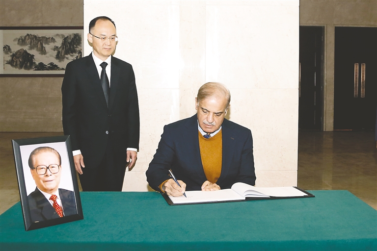 | 12月1日,巴基斯坦总理夏巴兹在中国驻巴基斯坦大使馆吊唁江泽民同志。 新华社发(艾哈迈德·卡迈勒 摄) |