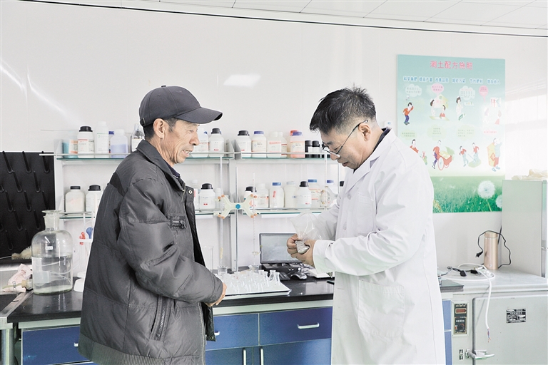 兴安盟突泉县太平乡土壤检测分析实验室内,专家林柏杉正在为白庙子村村民王连月进行测土配肥检测。今年年初,中国气象局在太平乡投资建设了具备测定土壤氮磷钾、有机含量等要素的太平乡土壤检测分析实验室,实施了农作物品种优选示范项目,并同步示范推广保护性免耕技术、测土配肥技术、节水灌溉技术和先进植保方案,为农户科学种粮、增产增收提供参考和支撑。 (本报记者 高敏娜 通讯员 曾令刚 摄)