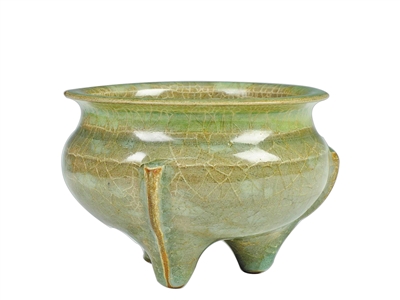 珍藏于浙江省博物馆的南宋哥窑青瓷鬲式炉高6.4厘米,口径8.7厘米,圆口,平沿微外卷,短颈,扁圆腹,乳形三足,腹与足背饰三角形凸脊,肩部饰弦纹一圈。灰胎,釉色青黑带黄,足底无釉,呈土黄色,开冰裂纹。内底足部相应处内凹。