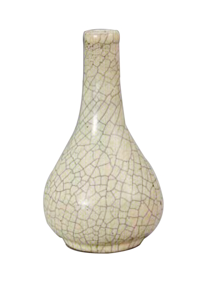 开裂,原本是瓷器烧制中的缺陷,可是哥窑却在无意中形成了独特的美。哥窑瓷还有神奇的一面,轻击瓷胎,听到的不是一般瓷胎的金石声,而是近于破碎的“噗噗”声,这是哥窑瓷器似裂未碎的技艺精湛之处。