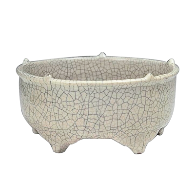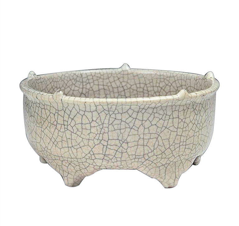 公元1127年,“靖康之变”逼迫宋室南迁,最终定都临安(杭州),南宋至此形成,带来新一轮的人口大迁移,对江南文化产生了极大影响,特别是在城市生活方面,杭州成为闻名的大都市。南宋的精致化生活体现在日用器物上。这件南宋哥窑五足洗仿制古代青铜器的造型,高9.2厘米,口径18.8厘米,底径7.2厘米,圆唇,直腹,平底,浅圈足,内心微下凹,口沿饰乳钉5枚,矮圈足不着地,圈足内施酱色釉,下承5个如意形扁足。