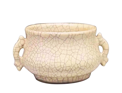 哥窑是宋代五大名窑之一,相传为南宋时章氏兄弟所创,分别为哥窑与弟窑,弟窑又称龙泉窑。哥窑器物以纹片著名,纹片多为黑色,俗称金丝铁线。按颜色分有黑蓝纹、浅黄鱼子纹、血纹;按形状分有网形纹、梅花纹、细碎纹等。哥窑开片的特点是平整紧密,片纹裂开成上紧下宽状,黑色纹片中有时闪蓝色。