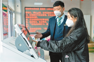 在中国邮政呼和浩特市分公司乌兰小区支局金融服务一体机前,工作人员协助市民办理金融业务。 本报记者 怀特乌勒斯 摄