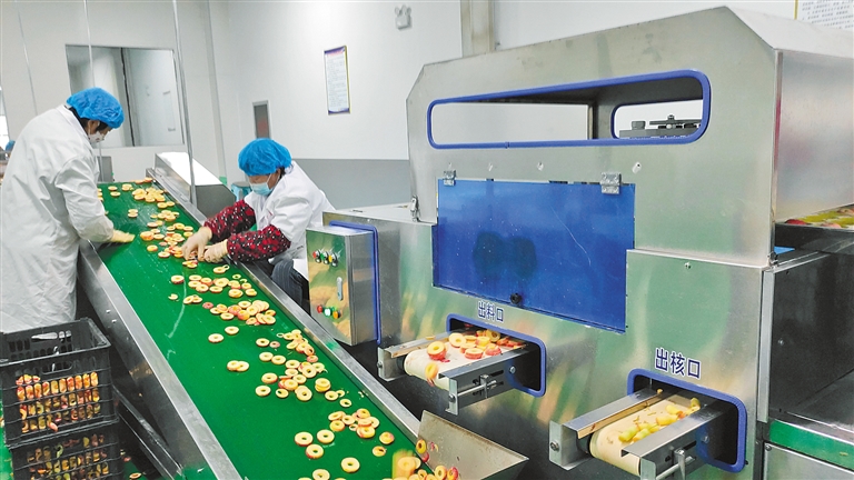 近日,在赤峰市林西县新城子镇的果蔬收储及深加工产业园内,工人们正在生产果脆。去年以来,新城子镇引进了果蔬深加工企业,以123小苹果、沙果等当地水果为原材料,通过“公司+基地+农户”的发展模式,形成了生产、加工及销售为一体的特色化产业体系,带动当地老百姓增收致富。陈晓云 刘莹 摄